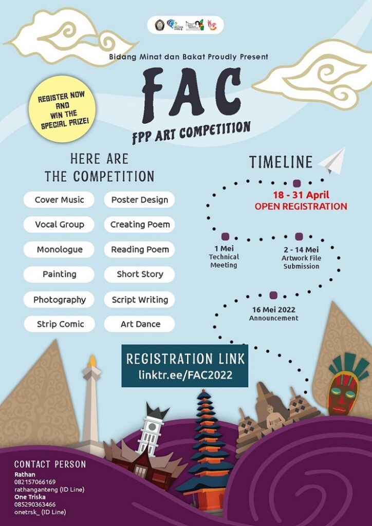 [FPP ART COMPETITION 2022] Bidang Minat & Bakat BEM FPP UNDIP 2022 dengan bangga mempersembahkan: 🎼🎨🎭FPP ART COMPETITION🎭🎨🎼 FPP Art Competition (FAC) 2022 merupakan kegiatan pentas kesenian sekaligus ajang audisi di tingkat fakultas yang diselenggarakan oleh BEM FPP UNDIP untuk mencari bakat-bakat terbaik di FPP Dengan beberapa cabang seni yang diperlombakan, yaitu: – melukis – […]