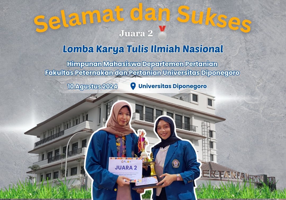 Mahasiswi Fakultas Peternakan dan Pertanian Universitas Diponegoro (FPP Undip) berhasil meraih Juara 2 Lomba Karya Tulis Ilmiah Nasional yang diselenggarakan oleh Himpunan Mahasiswa Departemen Pertanian Fakultas Peternakan dan Pertanian Universitas Diponegoro pada tanggal 10 Agustus 2024.