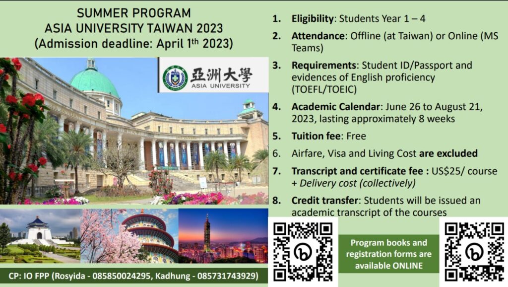 Halo Mahasiswa FPP UNDIP! Tertarik dengan kegiatan exchange ke Universitas Luar Negeri? Terbuka pendaftaran SUMMER PROGRAM 2023 di Asia University Taiwan. Terdapat 11 courses yang bisa kamu pilih dan ikuti. Berminat? Langsung daftarkan diri kamu dengan melihat persyaratan di bawah ini : Download flyernya di [button link=”Flyer Summer Program” type=”big” color=”black” newwindow=”yes”] Program Book[/button] Bisa […]