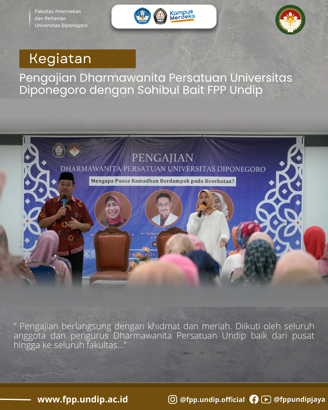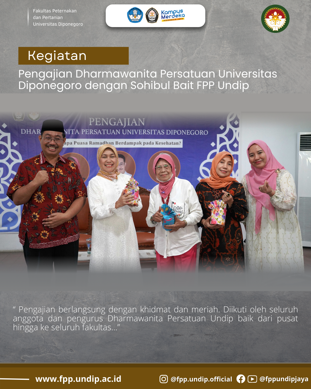 Fakultas Peternakan dan Pertanian (FPP) Universitas Diponegoro menjadi tuan rumah acara Sohibul Bait Pengajian Dharmawanita Persatuan Universitas Diponegoro, menjelang bulan suci Ramadhan. Acara yang dihadiri oleh para perwakilan dari berbagai fakultas dan komunitas akademik ini berlangsung dalam suasana khidmat dan meriah.