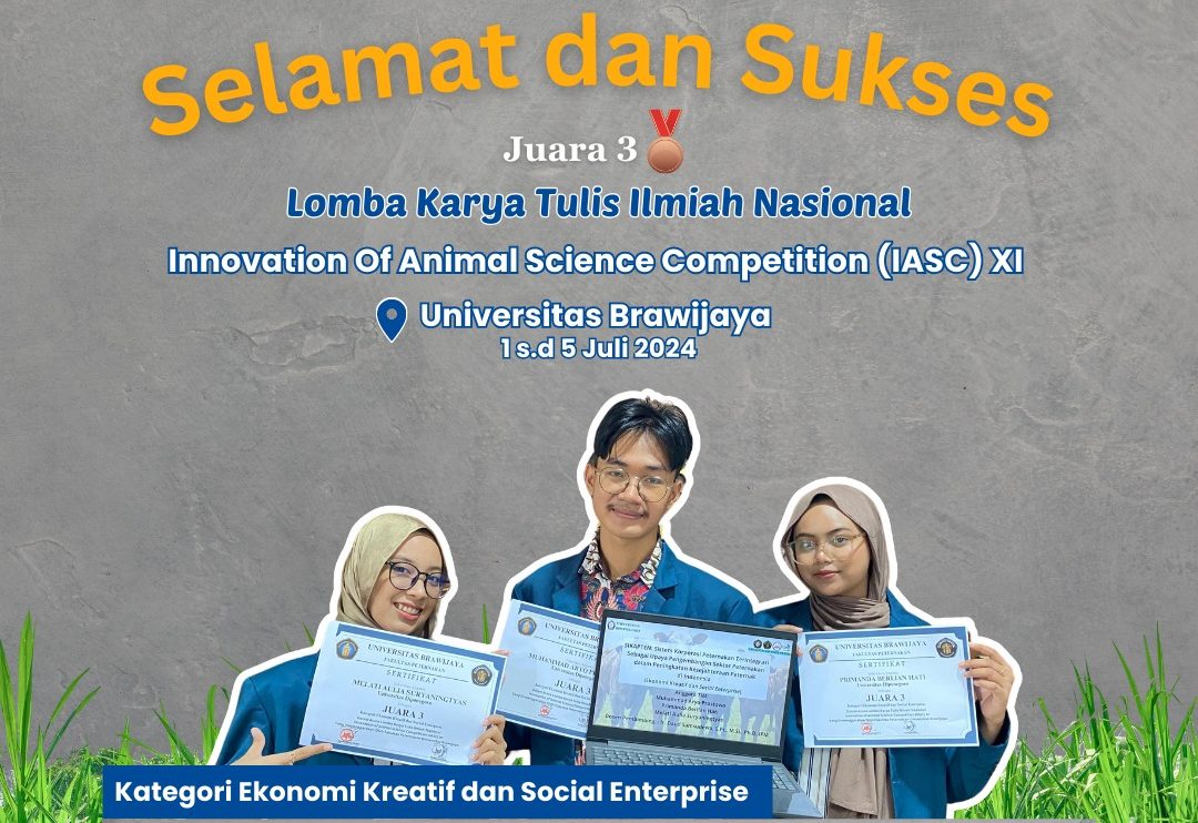 Mahasiswa Program Studi S1 Peternakan Fakultas Peternakan dan Pertanian Universitas Diponegoro (FPP Undip) berhasil meraih Juara 3 Lomba Karya Tulis Ilmiah Nasional Subtema Ekonomi Kreatif dan Social Enterprise dalam ajang “Innovation Of Animal Science Competition (IASC) XI” yang diselenggarakan di Universitas Brawijaya Pada Tanggal 1 s.d. 5 Juli 2024.