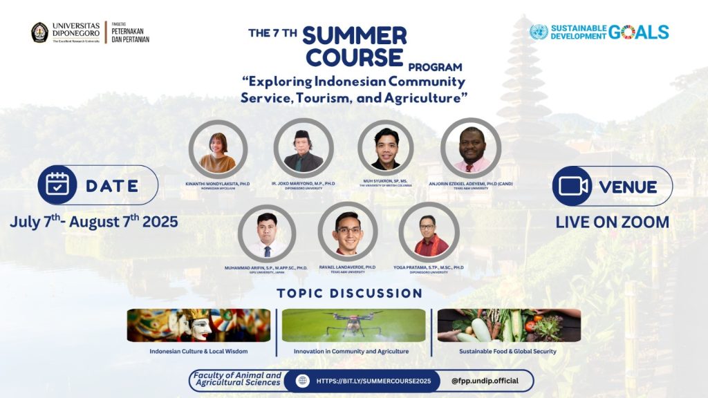 Semarang, Indonesia — July 9, 2025 — The Department of Agriculture, Faculty of Animal and Agricultural Sciences (FPP), Universitas Diponegoro (Undip), has once again successfully launched its flagship international academic program: the 7th Summer Course Program under the theme “Exploring Indonesian Community Service, Tourism, and Agriculture.” This month-long program, held from July 7 to August […]
