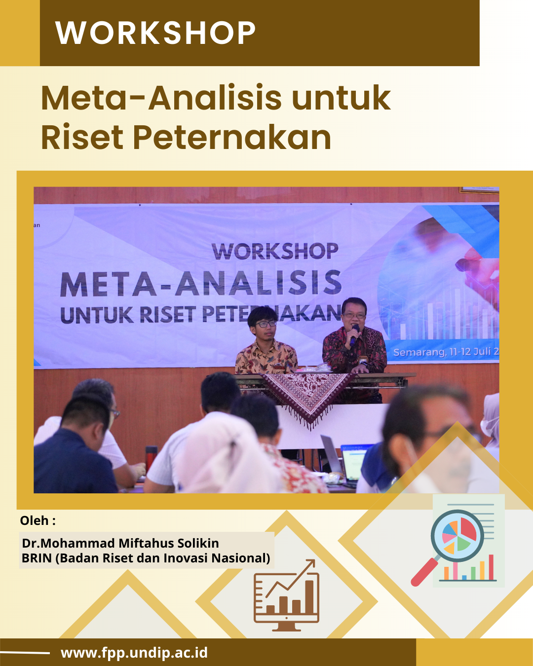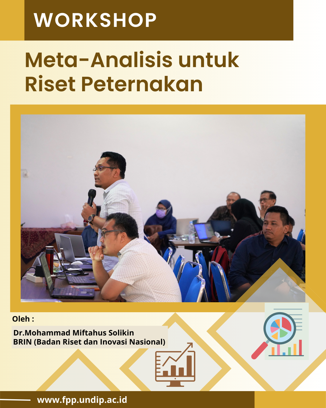 FPP UNDIP melaksanakan workshop Meta Analisis untuk Riset Peternakan. Kegiatan ini dirancang untuk memberikan wawasan baru, pelajaran berharga, serta kesempatan untuk meningkatkan pengetahuan dan keahlian, serta berinteraksi dan tanya jawab langsung dengan yang ahli di bidangnya, khususnya meta analisis.